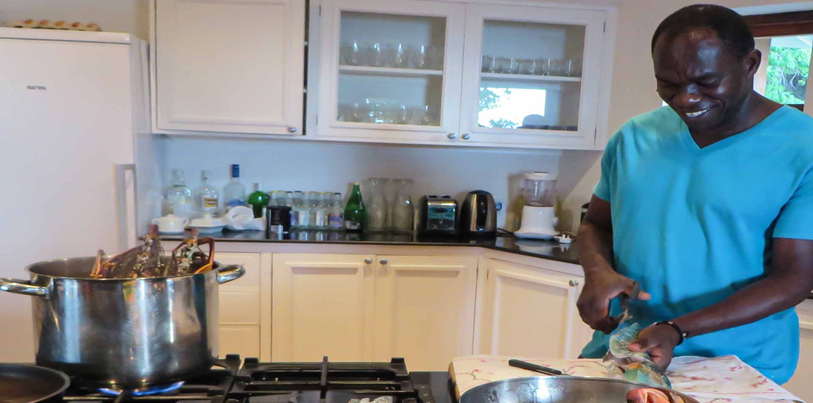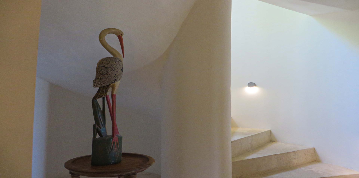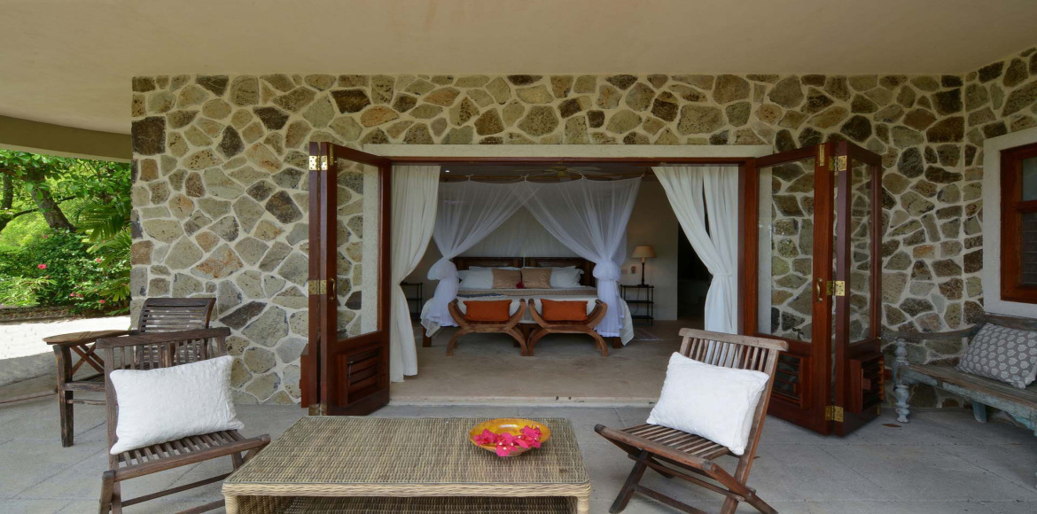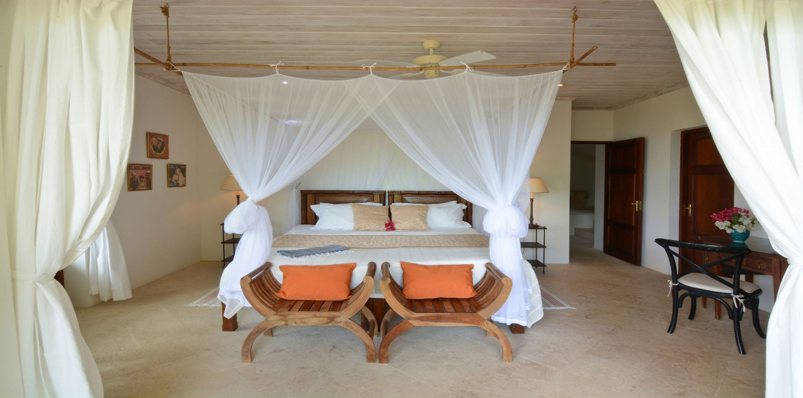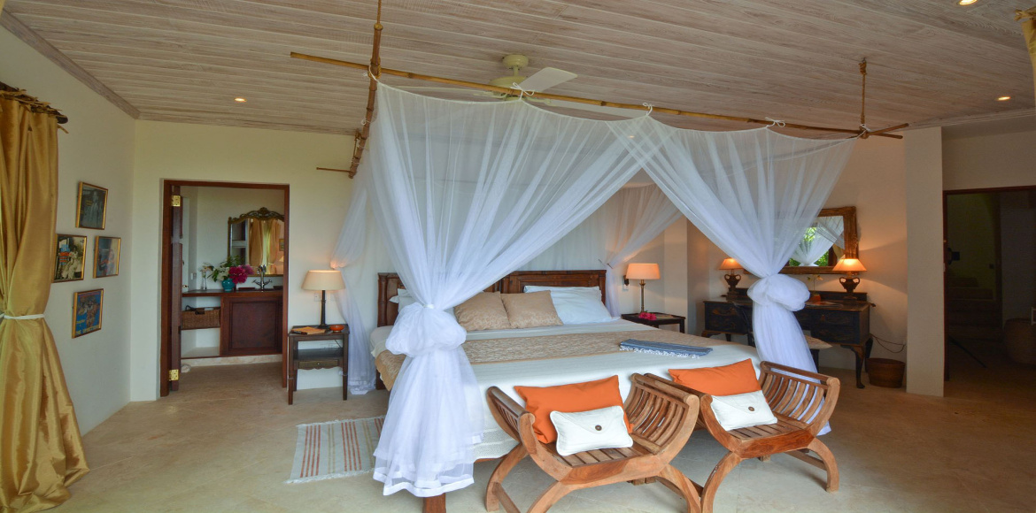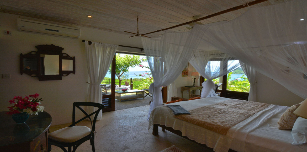 The villa comprises four double ensuite bedrooms. The primary bedroom has a private ocean-facing terrace, a large dressing room, a shower, and a bathroom. A coral stone spiral staircase leads to a hall at a lower level on the hillside with a small fridge for drinks the two double ensuite bedrooms. The beds in these two bedrooms can be made up of twin or king-size beds. Both rooms lead out onto their private terraces with views of the ocean.Staff