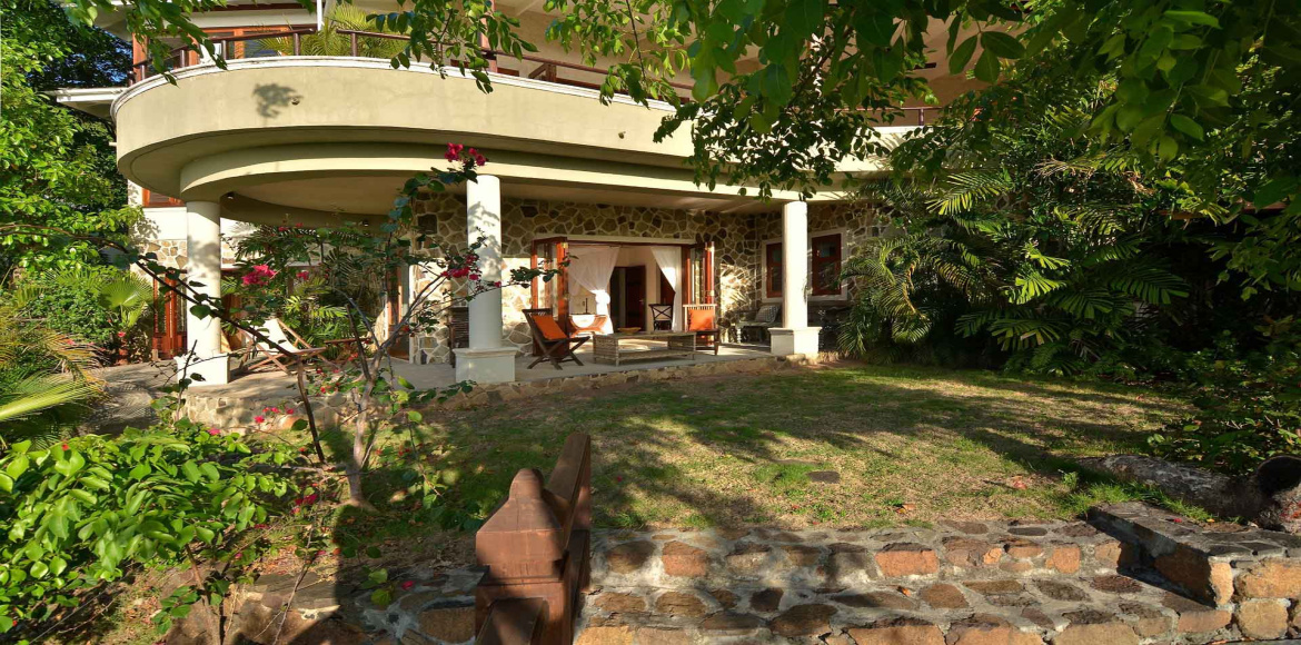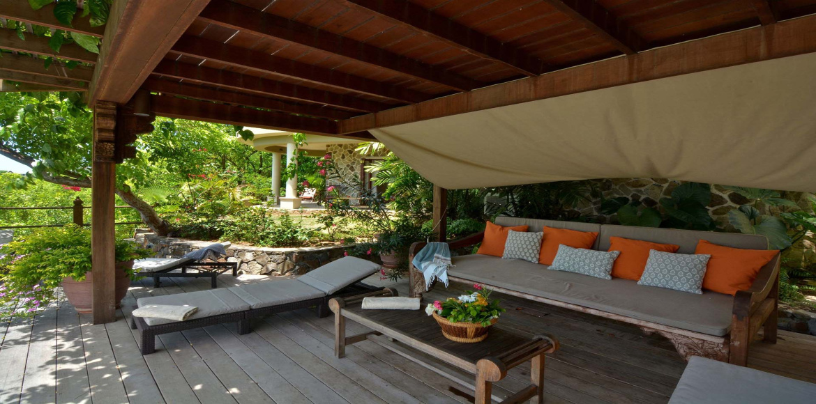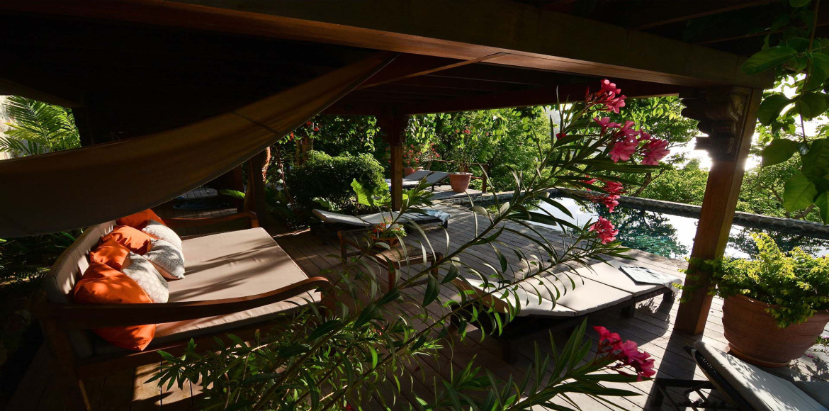 The main entrance leads through an entrance hall straight into an open-plan living room with three sets of large double doors opening out behind the house into a courtyard planted with frangipani and ginger lilies. Here, water flows over the edge of a large stone urn into a pool of lilies beneath. From the courtyard, an external staircase leads up to a sun deck with far-reaching views of the sea, equipped with loungers for sun worshippers who are after some secluded privacy. The fully equipped kitchen is to the left of the living room, and the outdoor annexe to the kitchen houses a barbecue. The spacious living room seats nine comfortably and has a 32-inch wall-mounted television and DVD player that supplies local and American cable channels.Outdoors